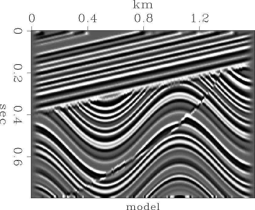 These properties are examined more closely in the next synthetic example. Figure 10 shows a more sophisticated model that contains a fault, an uncomformity and faulting structures Claerbout (1995). For better displaying, we extract the central part of the model and compare it with the migration results of different methods in Figure 11. Comparing the plots shows that the reciprocity method successfully removes the aliasing artifacts (round-off errors) of the aliased (nearest neighbor interpolation) migration. At the same time, it is less harmful to the high-frequency components of the data than triangle filtering. This conclusion finds an additional support in Figure 12 that displays the average spectrum of the image traces for different methods. Both of the antialiasing methods remove the high-frequency artifacts of the nearest neighbor modeling and migration. The reciprocity method performs it in a gentler way, preserving the high-frequency components of the model.