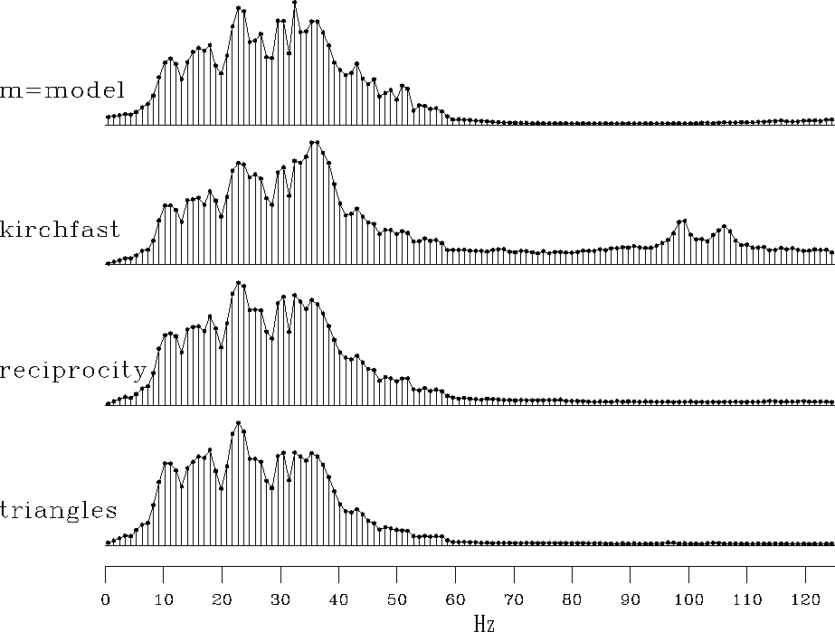 Figure 12 Top is the spectrum of the model. The other plots are the spectra of the migrated images. The second plot corresponds to the modeling/migration without account for antialiasing. The third plot is modeling/migration with the reciprocity antialiasing. The bottom plot is modeling/migration with triangle antialiasing. | ![]() |