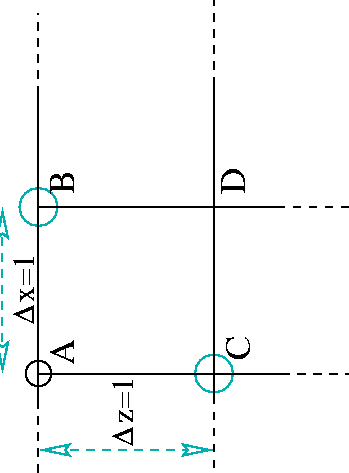 Figure 3 A simple Cartesian-coordinate grid configuration. In this model, the slowness equals 1. Grid A is set, and B is the minimum traveltime along the front that includes B and C. We then compute D as a neighbor of B. | ![]() |