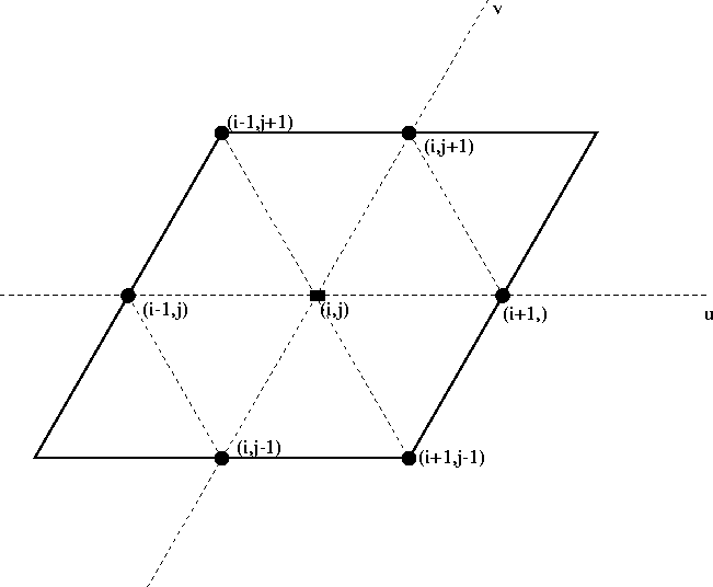 The fast-marching algorithm is an upwind first-order discretization of the above eikonal equation. In next section, we show that it reduces to solving a quadratic equation. The key feature of this algorithm is a carefully selected order of traveltime evaluation. In the Cartesian coordinates, each point with known traveltime can update four equally-spaced neighboring points in 2-D and six in 3-D, as shown in Figure 2 and 3. In the trigonal and tetragonal coordinates, these two numbers are six and twelve respectively, as shown in Figure 4 and 5. Since the fast-marching eikonal solver is based on the plane wave assumption, more equally-spaced neighboring points mean a better approximation to the assumption. Therefore, TFMES should be more accurate than its Cartesian counterpart.