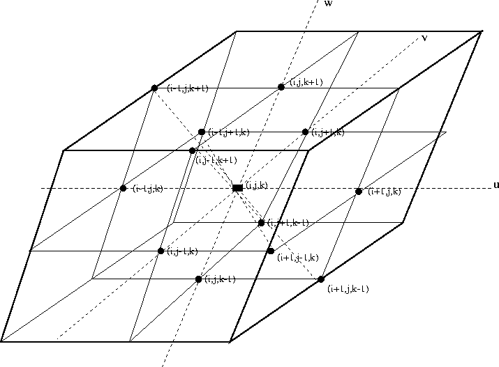 Figure 5 3-D updating scheme in the nonorthogonal coordinates. Traveltime at point (i,j,k) is known and twelve equally-spaced neighboring points' traveltimes are candidates for updating. | ![]() |