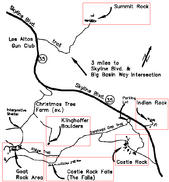 To get to Goat Rock, refer to the excellent area map (top of page) provided by Clint Cummins. Start Early! Goat Rock has toprope-able routes in the 5.4-5.7 range. Therefore, Goat Rock will be very crowded if you get there late! Kim and I hit the parking lot at 06:45, the first ones to park on Skyline Boulevard, since the gate is locked until 07:00. When we returned at noon, there was nary a spot on Skyline or in the official CRSP lot.
