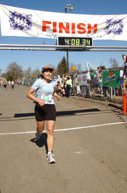 Put simply, I don't feel the need to engage in the same post-race self-flagellation as after the BSIM. While I didn't run an optimal race, I ran a good-enough race and didn't quit. Based on my training, state of health on race day, and the weather, I did my best and achieved my goal. End of story. Which makes me feel all the worse for Kim. She ran a 4:08.33 marathon. Not a bad race; she finished 217th out of 684 women, or in the top 32%. My time, on the other hand, earned me 372th out of 872 men, merely in the top 43%. Still, she started walking around mile 22 and felt pretty bad about it--exactly as bad as I felt after the BSIM. Nobody likes to give up, especially not the type of person who runs marathons!
