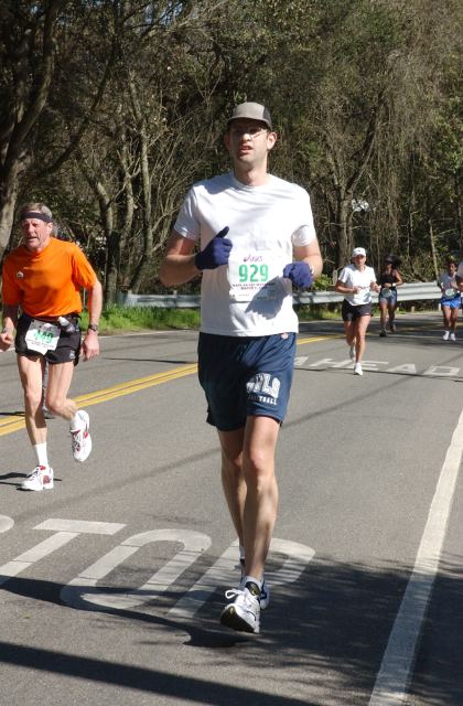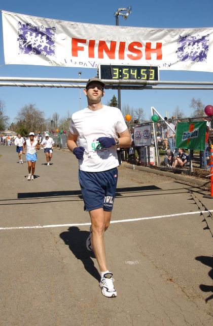 Well, somehow I finished the marathon. Physically, it was tougher than the Big Sur. Mentally, I was better prepared. I hit the wall around mile 22, but was able to keep running...well, plodding, to the finish. I believe I was running solid a solid 8:45 pace until 22, but I finished with a 3:54:52 marathon, for an 8:58 pace. The NVM doesn't do chip timing, so (arbitrarily) subtracting a minute from my finish time would give an 8:56 pace. Looking at my pre-marathon predictions, I finished between my "low" and "medium" predictions, but closer to the medium. Frankly, I'm just tickled pink to have run a 4-hour marathon, and on my 30th birthday to boot.