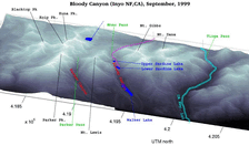 The name "Bloody Canyon" is certainly striking, but I had no clue as to the etymology. "skutumpah" on the Yahoo! "yosemitehikes" club sheds some light on this issue: