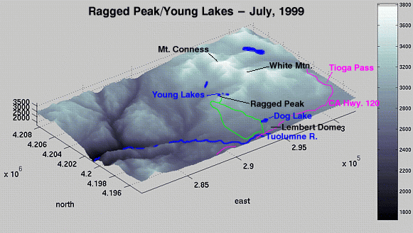 Deciding that the mosquitoes were too much, we made camp below the west ridge of Ragged Peak (10,900+) and elected to do some scrambling around Ragged Peak instead of making a trip to Young Lakes.