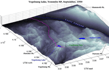 The winter of 1999 was mild in terms of total snowfall, so the streams and meadows were already dry, meaning fewer mosquitoes. We reached Vogelsang Lake (10,000'+) in the early afternoon and soon set up our campsite on the southwest ridge of Vogelsang Peak (11,000'+). I had no idea how beautiful Vogelsang Lake would be until I crested the lip and saw it for myself. The small glacial cirque is walled in to the north and south by Fletcher Peak (almost 11,000') and Vogelsang Peak, respectively. To the east is Vogelsang Pass. The views to the west are absolutely stunning. We could take in a good part of Tuolumne Meadows by looking down Rafferty Creek valley, which we came up on. The views to the south were also impressive, looking down the valley of Fletcher Creek.