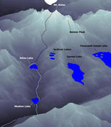 We also found the camping regulations (location, food storage, etc.) to be more restrictive than in Yosemite. Odd, until you realize that the Pacific Crest and John Muir Trails meet at Agnew Meadows. After our mandatory bus ride, we started from that trailhead at 11 am. The amount of foot traffic on the trail was unsurpassed relative to anything I'd seen in Yosemite, and this was a friday! The trail descends gently over the first couple miles to a footbridge over the San Joaquin River. From there, you climb about 700' to Shadow Lake. The abruptness and quality of the change in vistas amazed me. One minute, we were slogging up the switchbacks of a steep, blazing trail; the next minute we were along the shore of crystal clear Shadow Lake, with stunning views of Mount Ritter and Banner Peak.