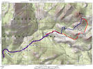I figured that our approach route up to the shoulder might be a little hazardous to walk down with heavy packs. Also, I thought it'd be nice to explore a little different region. In hindsight, the backside was kind of a drag; certainly no better than the normal approach. The initial descent dives hazardously down a steep gully. A couple tweaked knees and several curses resulted from the terrain here. From there, the idea is to follow the "stream" on the USGS map (now dry) to the south-southwest, then cross a "hump" to the saddle northeast of dome 7669'.