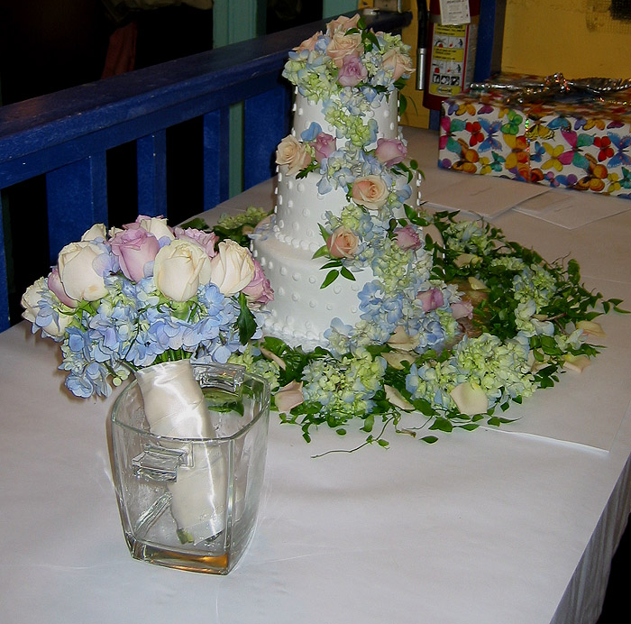 Kathy's Kreative Kakes did a wonderful job with the wedding cake. Edmonds Florist in San Mateo did a similarly nice job with the bouquet and all other flower arrangements.