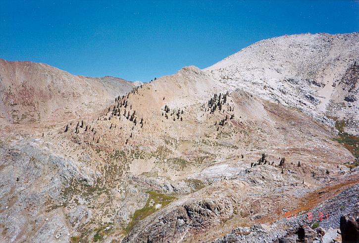 The Sawtooth Pass trail winds up switchbacks through the prominent talus slope on the right hand side of the photo. Glacier Pass sits hidden, approximately in the center of the photo.