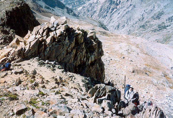 | VMorgan going over the edge of Glacier Pass. Though it may look impassible, just look for this rock outcropping near the center of the saddle and descend the loose, but class 2 rock to the bottom. Secor lists Glacier Pass as class 3. If so, it is easy class 3. |