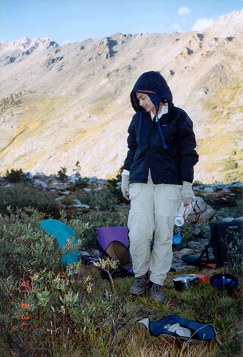Kim at our cooking spot on Spring Lake. Black Rock Pass and the Great Western Divide are behind her.