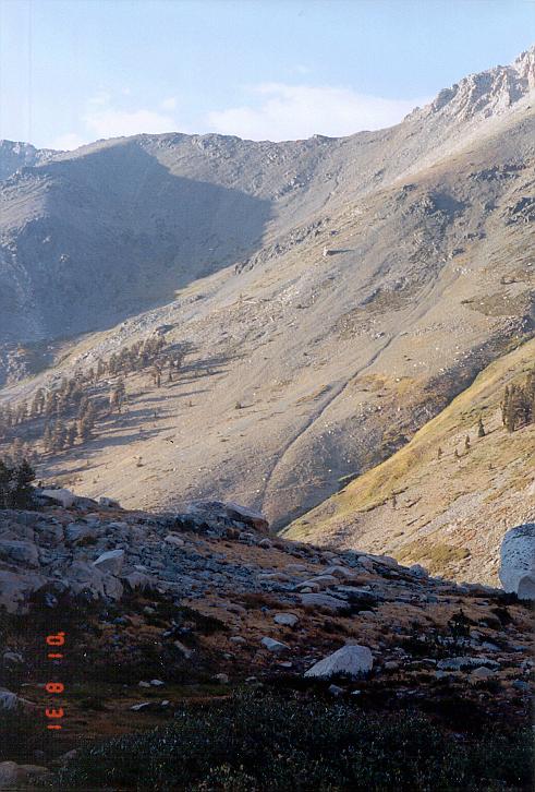 Zoom view of the switchbacks of the Black Rock Pass tral from the shores of Spring Lake.
