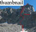 The route is fairly easy to follow. Other than local routefinding decisions (i.e., this crack or that slab?), there are only a couple perplexing decisions. One is where the West Ridge access gully joins the Southwest Face (stay right). The other occurs at around 13000', where you're faced with a 30-foot pitch of very steep climbing with death fall written all over it. In rock shoes, without a pack, and without the need to downclimb...maybe. But in this case, Tim found a nifty, if awkward, alternate path to the left, on the exposed spur of the gully. From here, it's another few hundred feet of sustained scrambling to the summit, an airy perch, but roomy enough for 3.