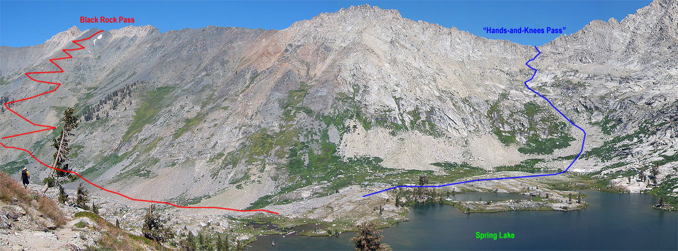 Black Rock Pass has an actual trail, but the cross-country portion from Spring Lake is fairly tedious, and the route is about 50% longer than the route over Hands-and-Knees. |