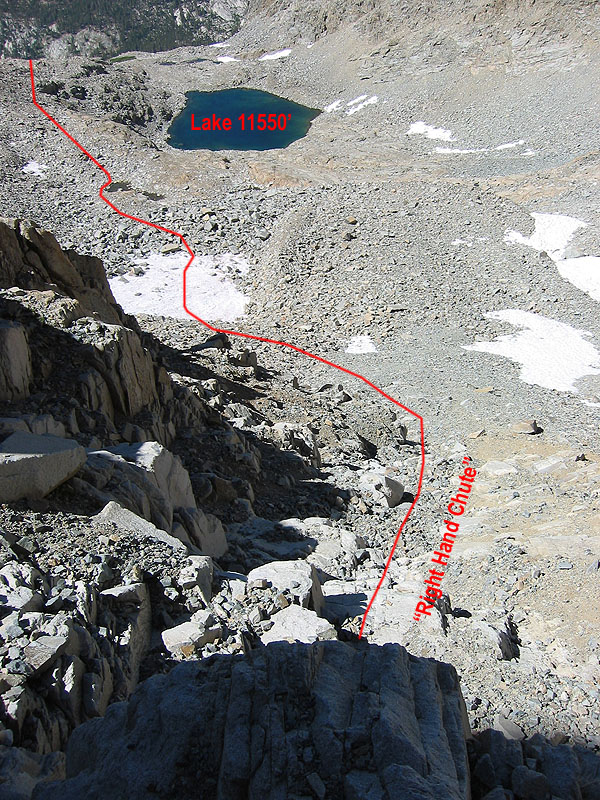 View of the approach to Black Kaweah's Southwest Face route from the start of the climbing.