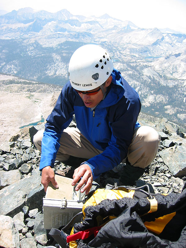 Robert prepares to sign the summit register...which dates from 1924! Amazing for a major Sierra Peak. Black Kaweah has probably received 100-200 ascents since the first ascent in 1921.