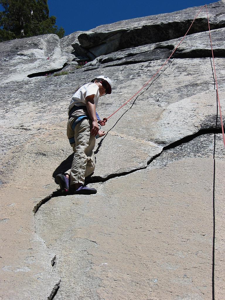 Kim resting on a fantastic (unnamed?) 5.8/9 route at Tiger Wall, Courtright Reservoir, CA.