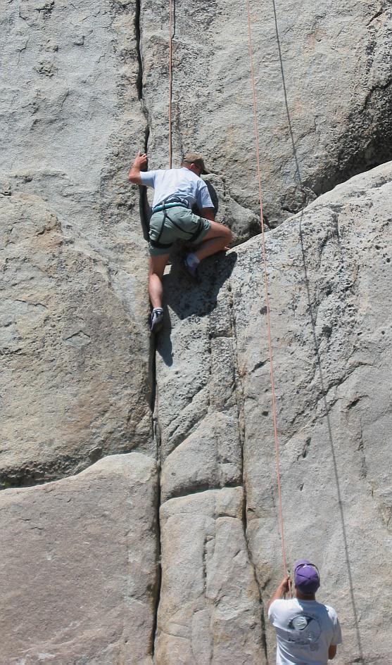 The Executive Officer, Bob, climbs a 5.8 crack at Tiger Wall, Courtright Reservoir, CA.
