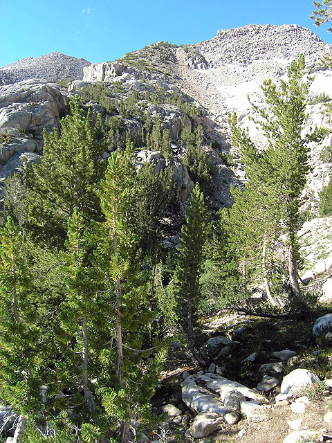 From below, the route toward Lamarck Col looks pretty intimidating. However, a nice use trail switchbacks through the talus and white Pines, making the steep climb up to the shoulder in the center of the image quite easy.