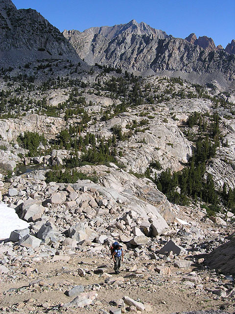 Kim climbing on the use trail to Lamarck Col. I believe we can see the Piute Crags in the background.