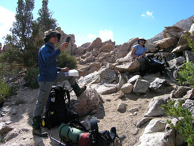 Kimberly and Robert at the day's first rest stop, at the 11,800-foot level on the use trail to Lamarck Col.