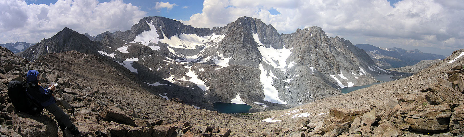 Panoramic view of Mounts Darwin and Mendel (left and right) and the five beautiful lakes in Darwin Canyon, from Lamarck Col, elevation 12,800 feet.
