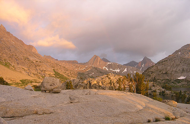 If you look closely, you can see a rainbow above Evolution Lake as a light rainstorm passed our first night's camp.