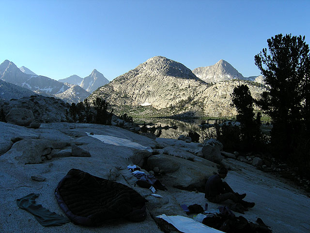 Our camp on Evolution Lake soon after dawn.