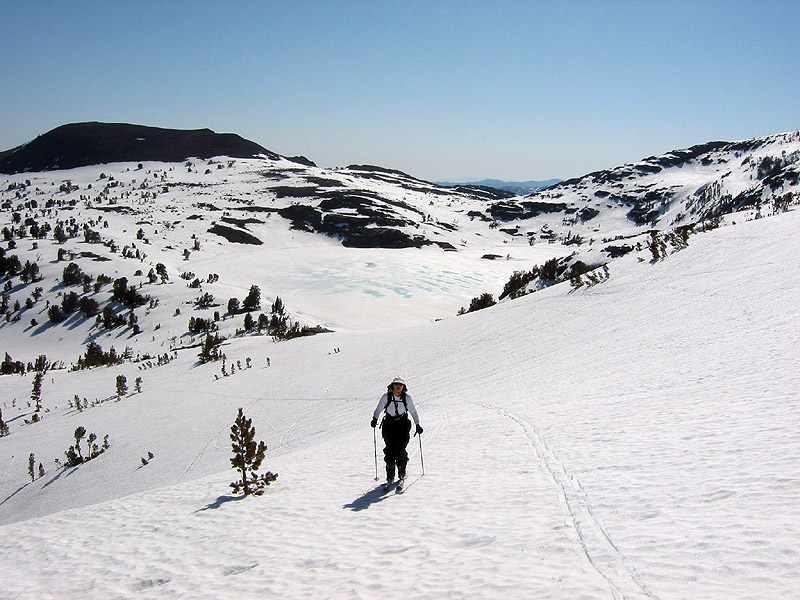 Kim ascending the west shoulder of Round Top, with Elephants Back and Winnemucca Lake in the background.
