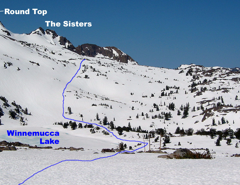 Our descent route from the west shoulder of Round Top. Very easy slopes; never exceeding 20° or so.