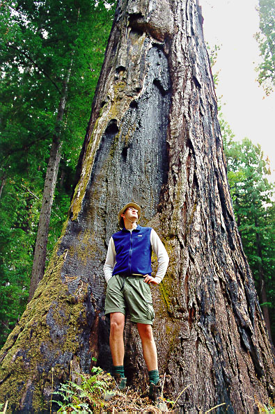 Morgan stands next to a burned-but-alive Redwood tree in the Navarro Redwood State Park.