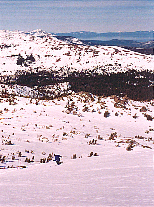 Robert turnin-and-burnin down Round Top's west ridge with a stellar view of Lake Tahoe.