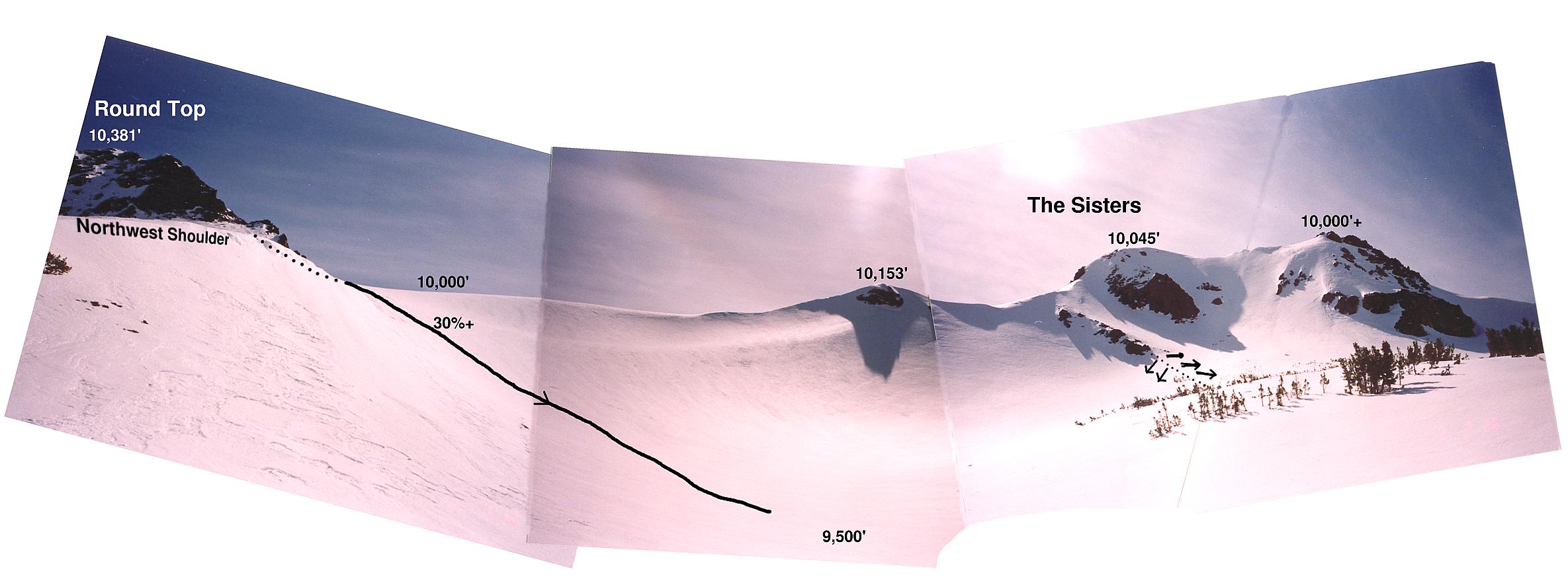 Panoramic view from Round Top's northwest shoulder west toward The Sisters.