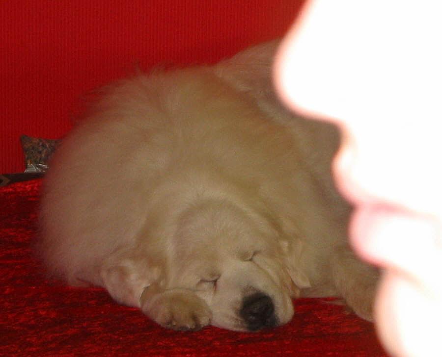 If not for the passing kid's face, this shot of a sleeping Greay Pyrenees puppy would've been a classic.