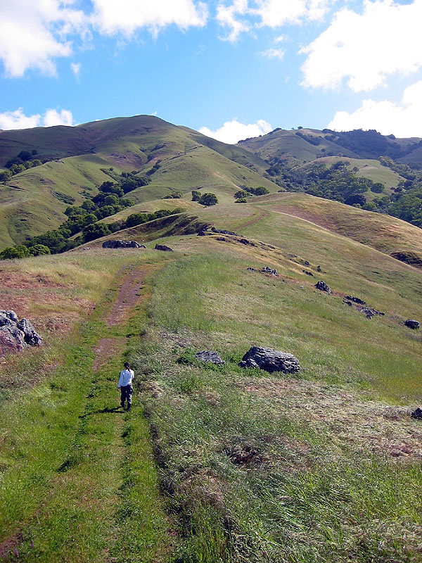 Kim hiking the grassy slopes along the Angel Kerley Road. Mount Diablo summit not visible from here.