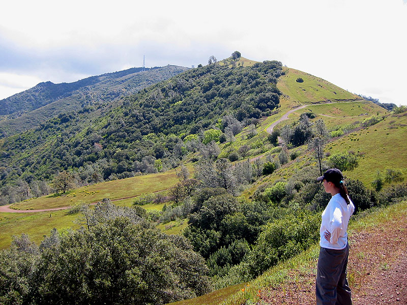 After cresting a small hill at 2500 feet elevation on Moses Rock Ridge, you obtain the first views of Mount Diablo's summit. The ascending trail on the left climbs out of Mitchell Canyon.