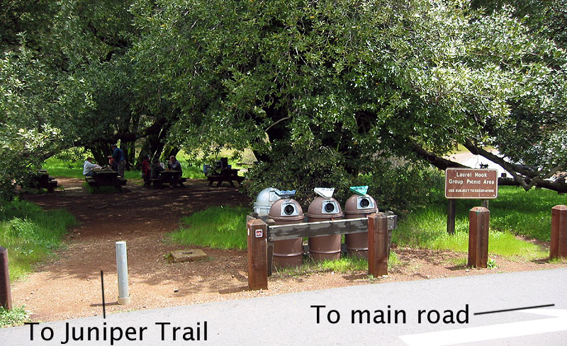 | The Juniper Trail can be pretty difficult to find on the way up. Here we've followed the Deer Flat Road, which becomes paved and travels through a campground. Just before reaching the main road, look for the "Laurel Nook Group Picnic Area" on the left. There is a trail marker on the other side of the street also. |