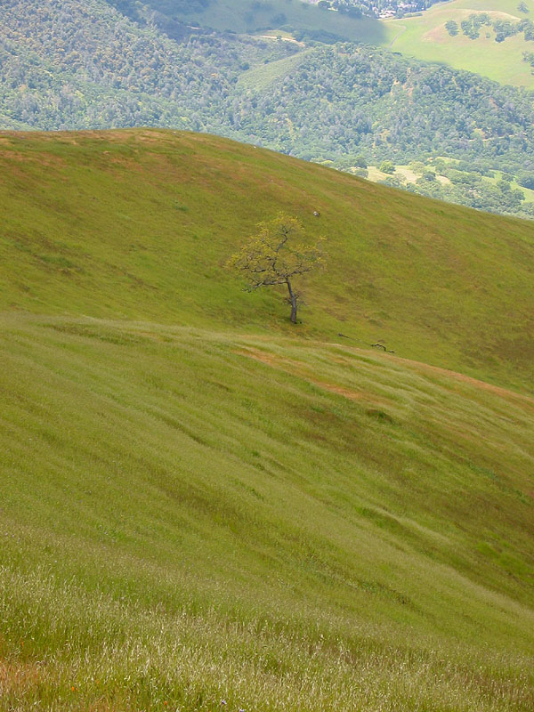 Lone Oak tree and steep grassy slopes. Mount Diablo is really high.