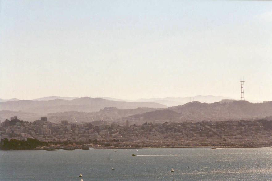 Telephoto shot from high point of Angel Island, southwest toward San Francisco. Twin Peaks on right. San Bruno Mountain left-center, medium distance. Montara Mountain is high point on right side, very distant.