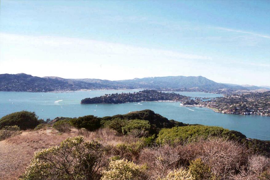 View to west from high point of Angel Island. Mount Tamalpais is prominent peak on right. Tiburon Peninsula in center. Sausalito on coast in distance.