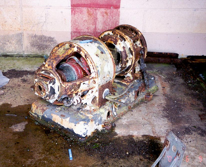 | Small generator found inside HIPAR building. Peter Snowberg says that this unit is a "a motor-generator (or MG set), used to convert the 60 Hz power from the generators, into 400 Hz power for some of the electronics. The frequency shift allows the amount of iron in transformers and motors to be reduced by about 80%; good for portable equipment. I'm wondering if this was for the air conditioning equipment? (it's in the AC sub-room of the HIPAR building) The MG sets at the launch area were MUCH larger..." |