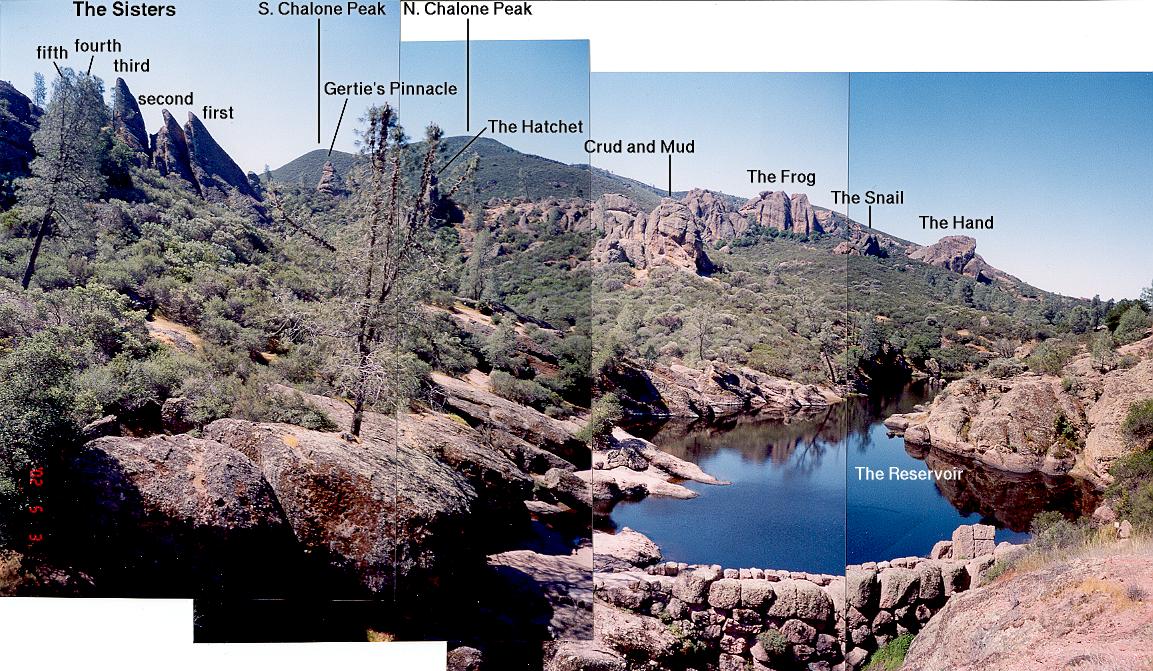 Panorama of "The Reservoir" climbing area, taken from above the dam on the Rim Trail. We climbed the 5.4