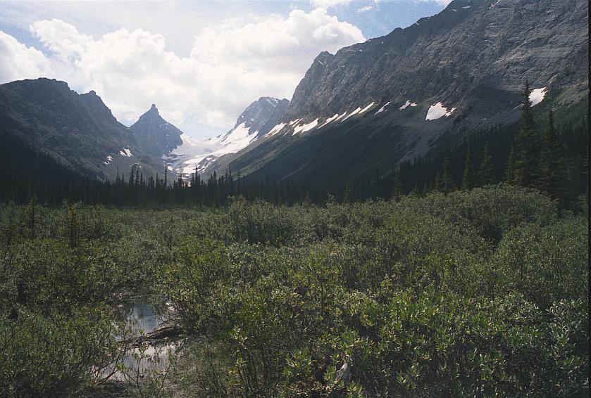 View up Burstall Creek valley, taken on the hike out, when there was no rain (though a bit of haze). Mount Sir Douglas (11,174') rules sovereign.