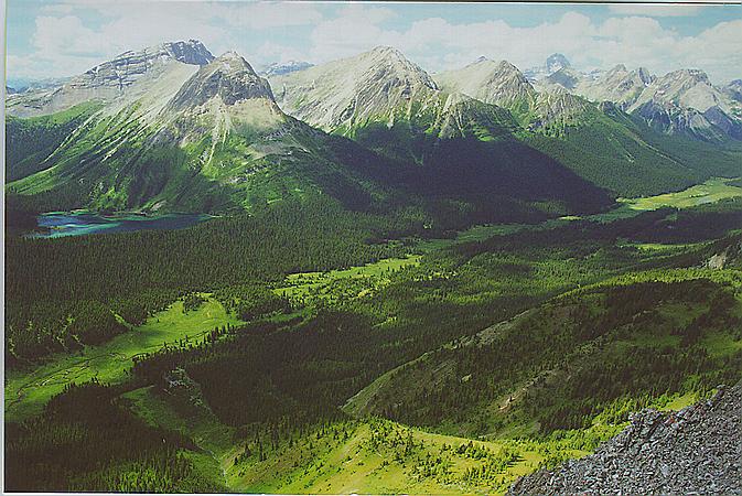 View to NW, down the Spray River valley, from 8300' ridge SW of Burstall Pass. From left to right: Leman Lake, Mount Leval (8700'), Mount Vavasour (9200'), Mount Warre (9000'), and in the distance, mighty Mount Assiniboine (11,870').