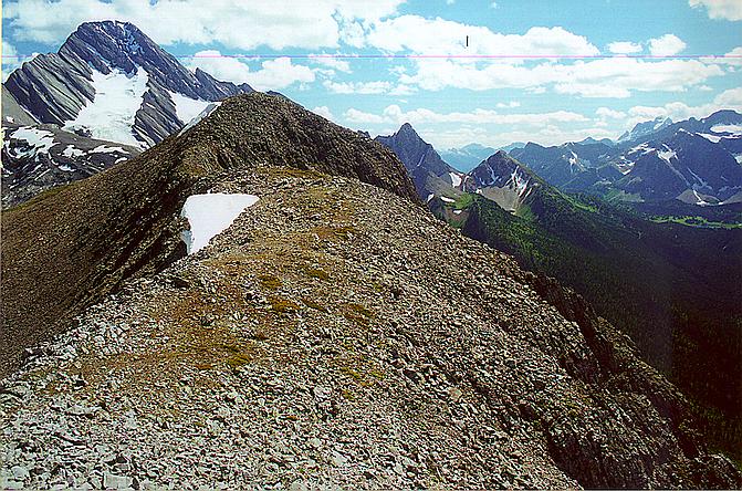 | View to South from 8300' ridge SW of Burstall Pass. Mount Sir Douglas is that mind-blowing 11,000'+ monolith on the left. The limestone has eroded into concentric flaking shells, very reminiscent of the granite domes of Yosemite. Mount Sir Douglas's east ridge is a similarly smooth, massive 60-degree slab. I believe it is named the "Burstall Wall", and has some classic alpine climbing. On the right of this photo is Palliser Pass, and the mountains of British Columbia beyond. |