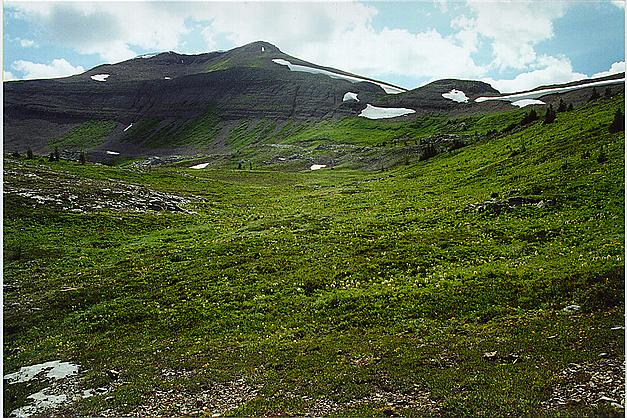| View SW from Burstall Pass, toward the 8300' ridge that we climbed. We traversed the ridgeline, then made a direct ascent up the ridge's rotten north face. Very easy climbing with a great reward: vastly superior views to that at Burstall Pass. Reserve an extra hour and climb it! |