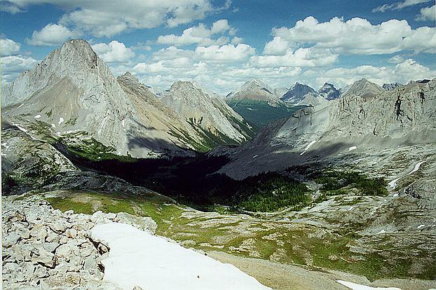 View down Burstall Creek Valley, from 8300' ridge SW of Burstall Pass. On the left is Mount Birdwood (10,160'). On the right we see the smooth limestone slabs of the "Burstall Wall", a.k.a the east ridge of Mount Sir Douglas.