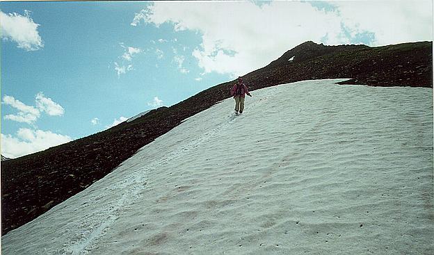 Kim glissading down from the 8300' ridge SW of Burstall Pass.